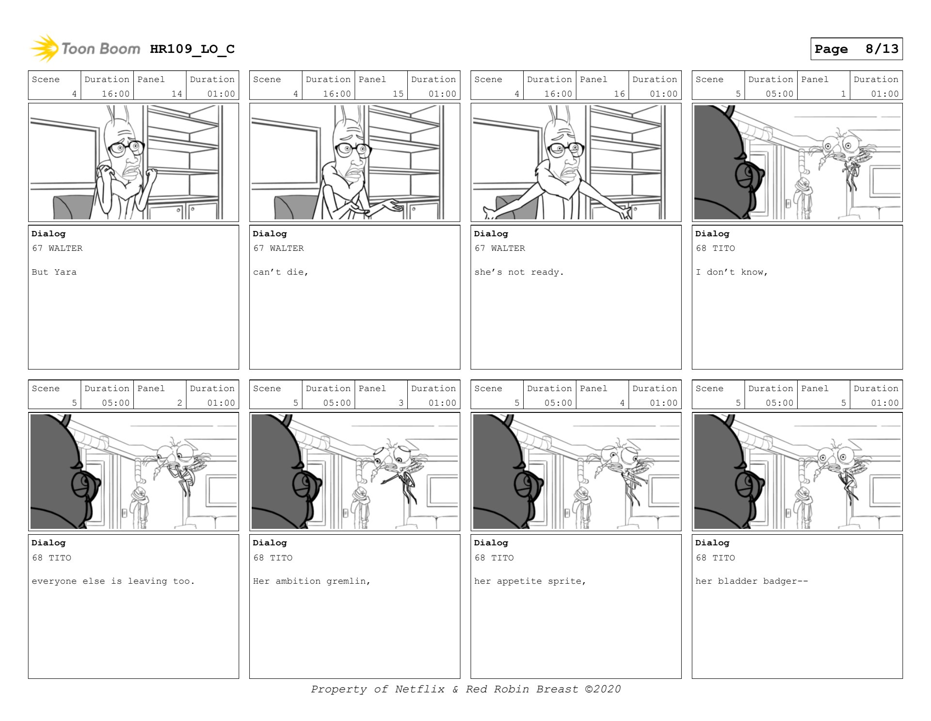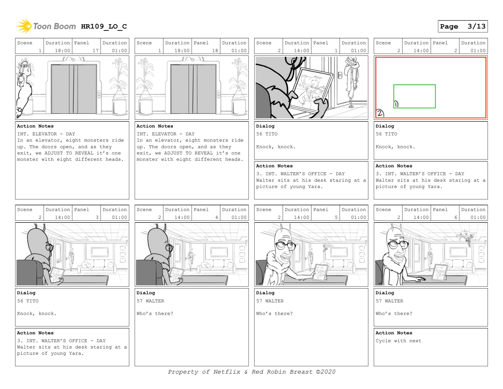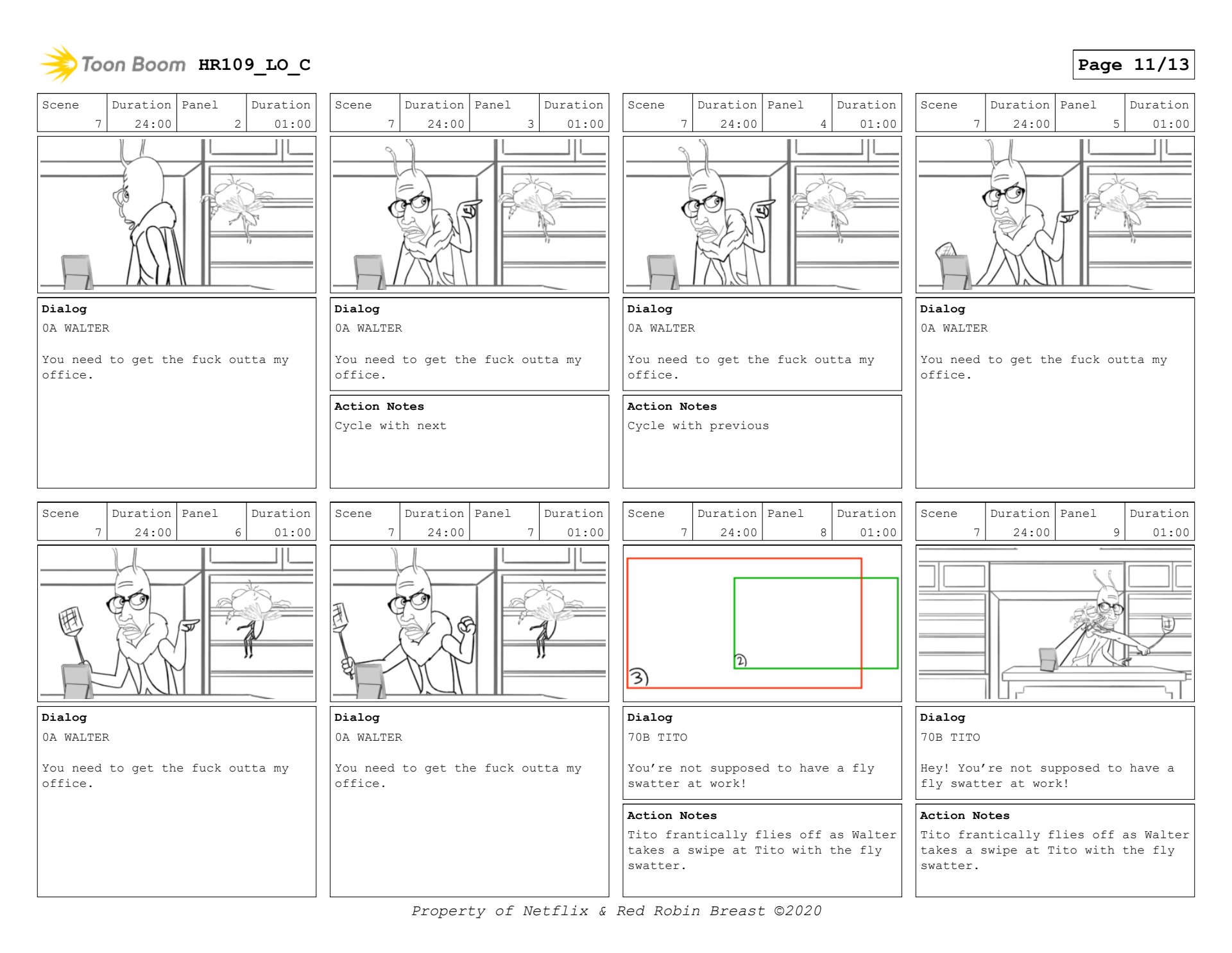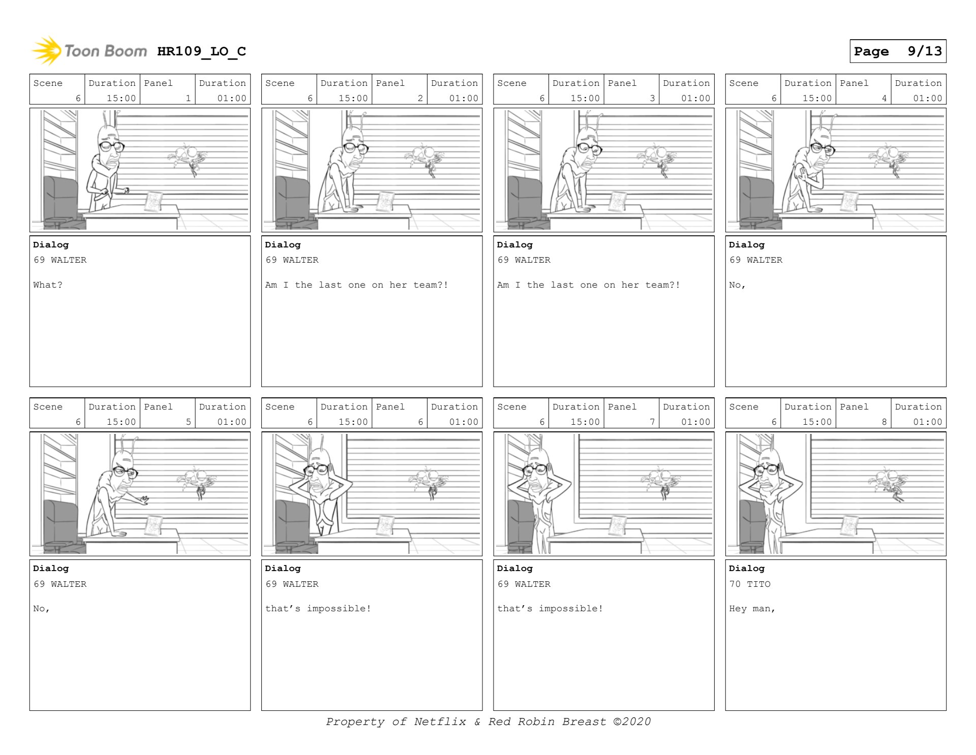 Human Resources boards for interstitial, and a scene with Walter and Tito. (keyframes only)